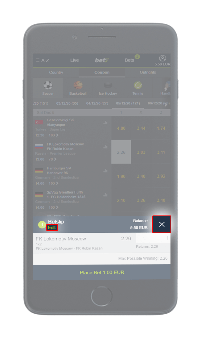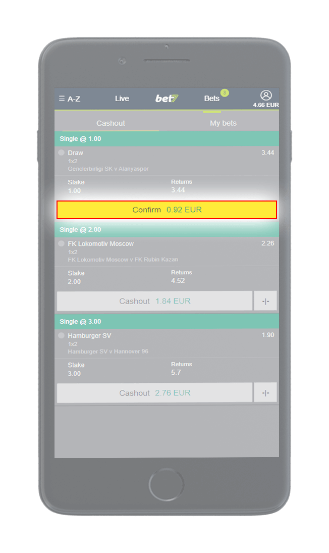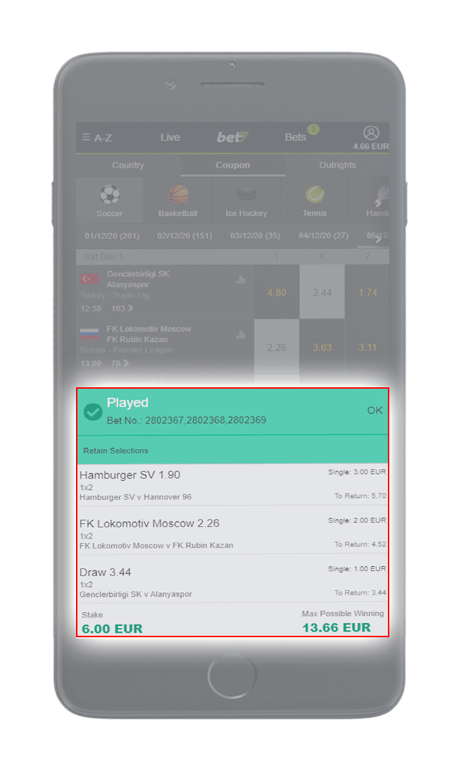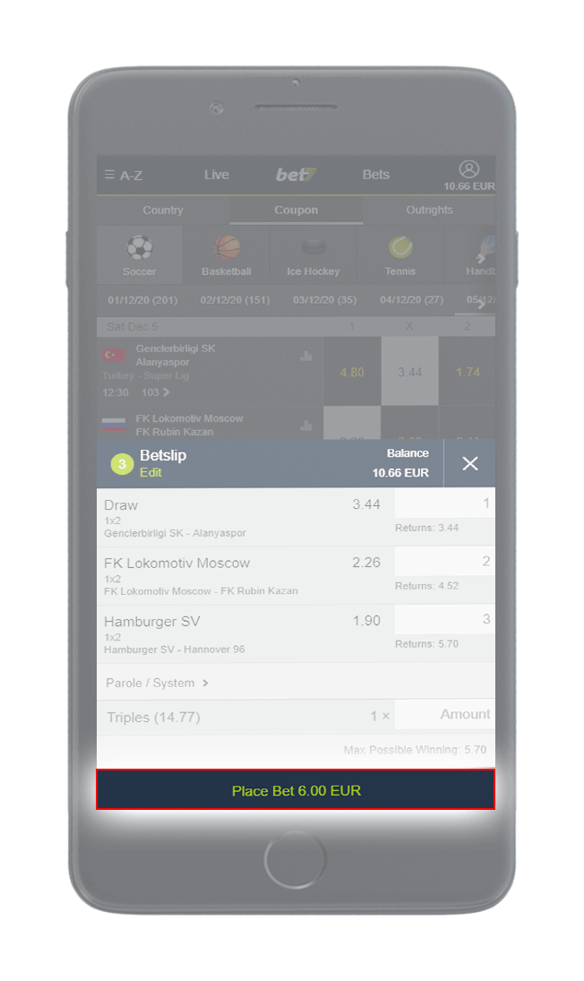 A bet can be submitted by tapping on the “Place bet” button. This action will trigger the bet placement process only if all entries and bet combinations are correct. Upon successful processing (i.e. bet accepted), you will be redirected to a confirmation page. If there are any problems, you will be informed accordingly via the optimized error notification feature.