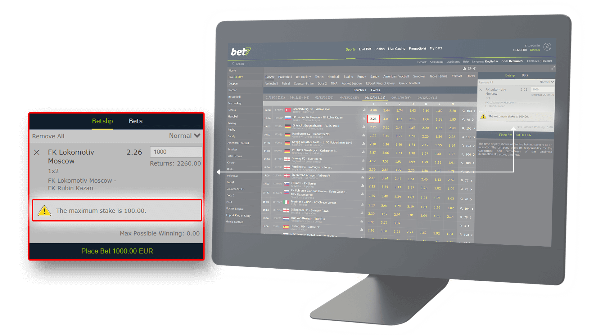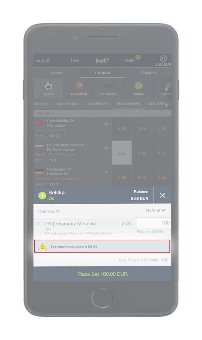 The maximum stake on a bet is calculated from the above-mentioned winning limit. If upon placing a bet you receive the message that your current stake exceeds this limit, please reduce your stake accordingly.