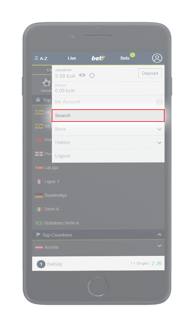 To quickly search for a specific team, league or player, you can use the embedded search function. The dedicated search page can be accessed via tap account (on right corner0 and then tap search Once the page appears,