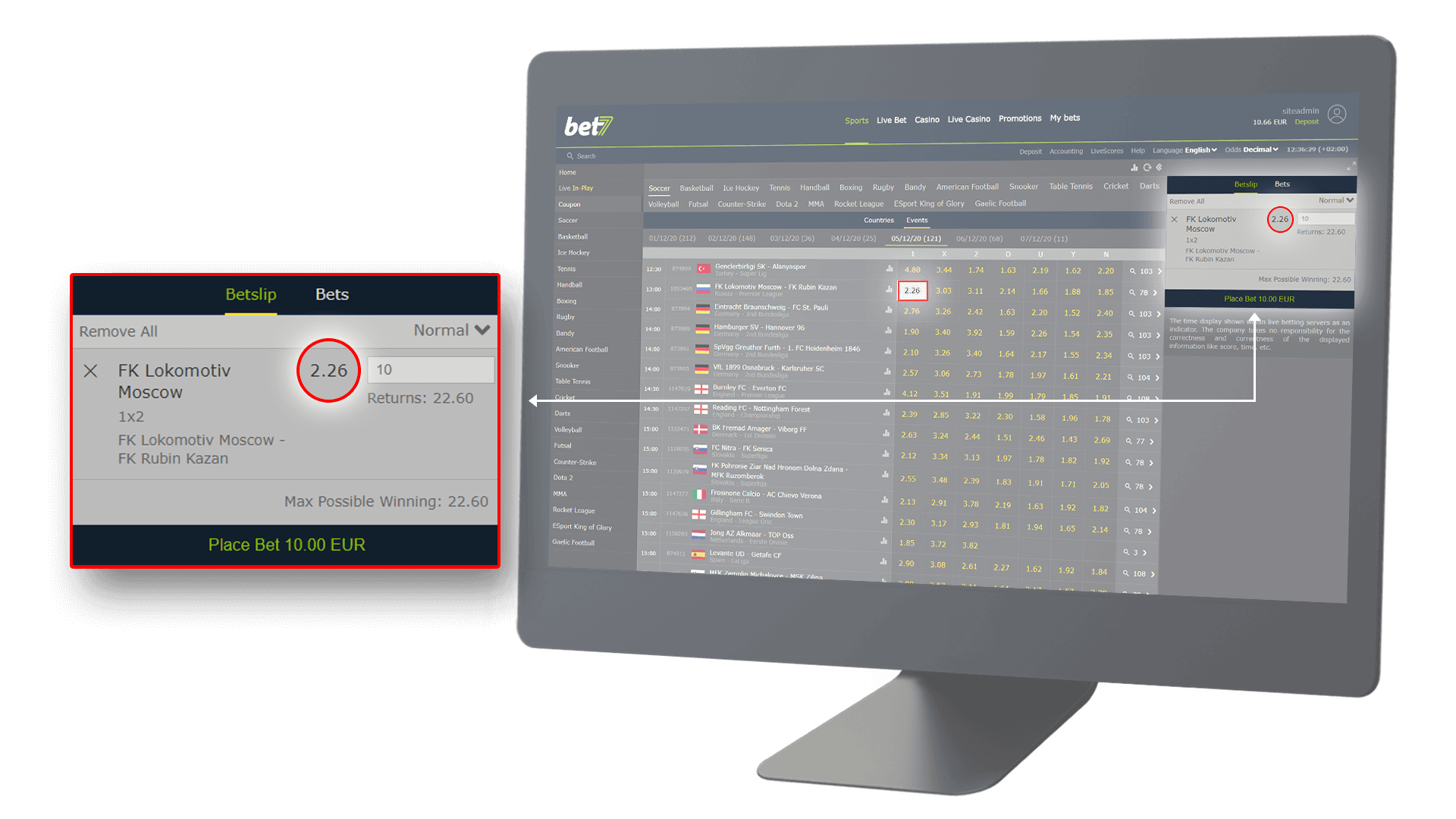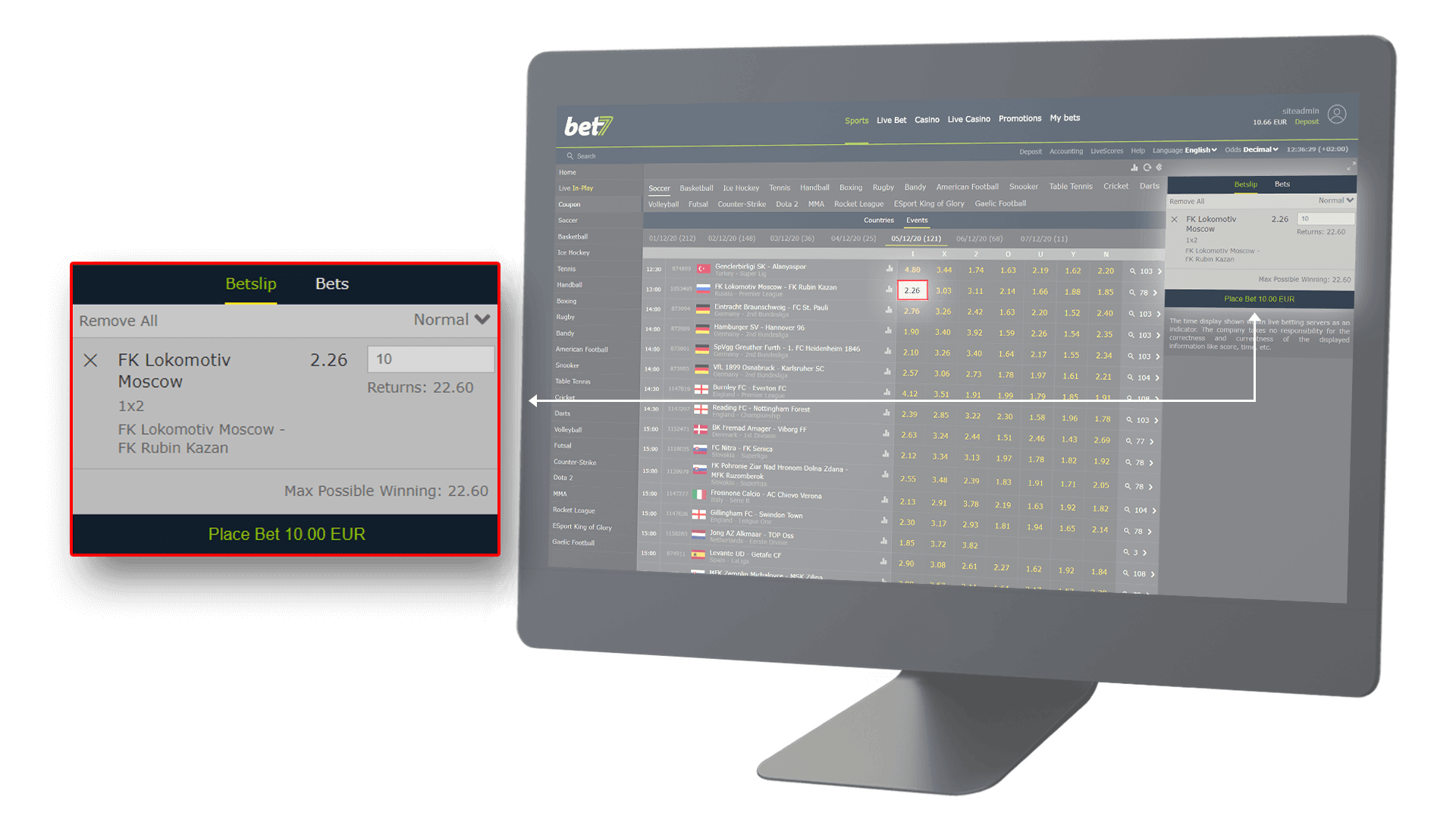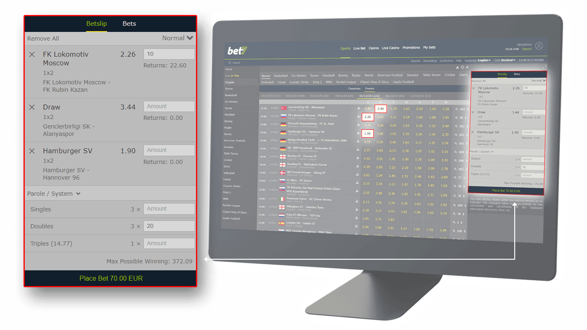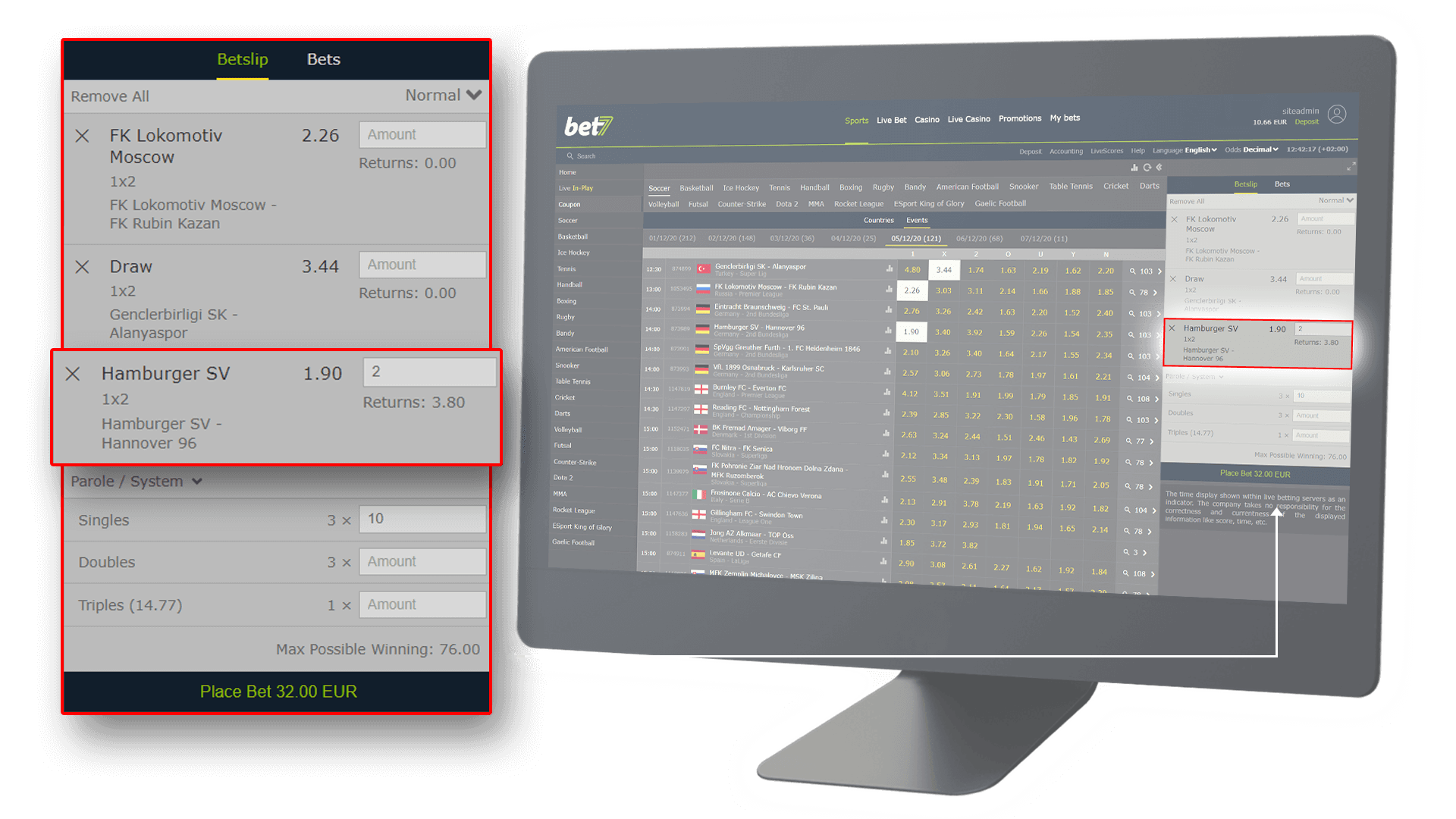 First, login with your user ID and password. Select one or several bets from our line-up and use the mouse to click on an outcome. Your bet will then appear in the bet slip on the right-hand side of the homepage. Next, specify the amount you wish to wager and your preferred category (single, multi, or system bets). If you want to confirm the final placement of the bet, click 'place bet’.