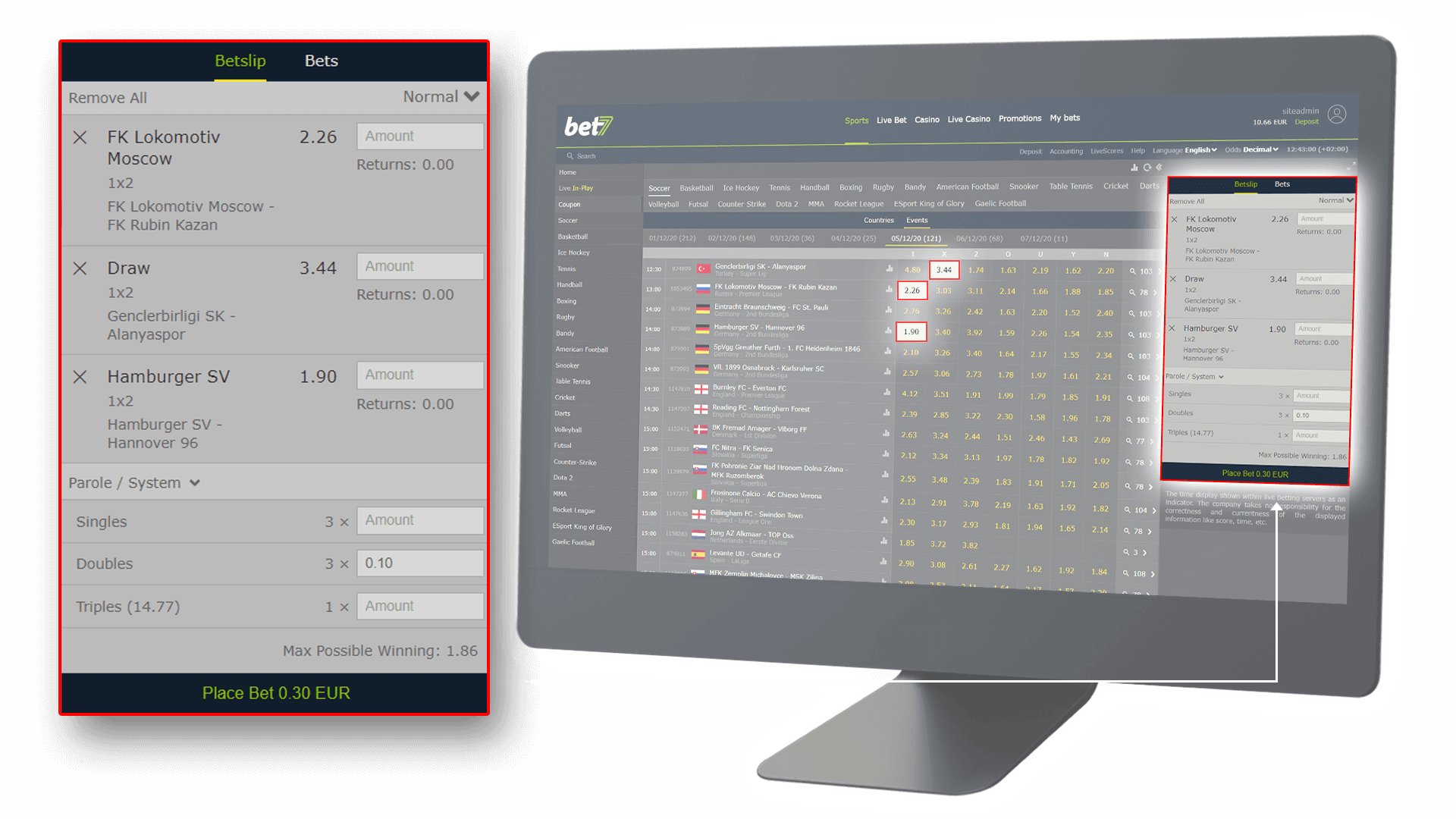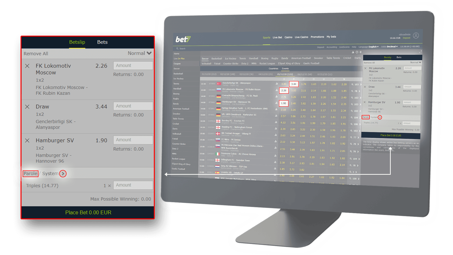 At we you can choose from three different types of bets. Starting with one pick, you can use the single bet option (single), with two or more picks you can place parole bets, and with three or more picks you can place a “system” bet. Please note: If you opt for more than two picks, the system proposes the parole by default. If you would prefer to place single or system bets, you need to select the desired option.
